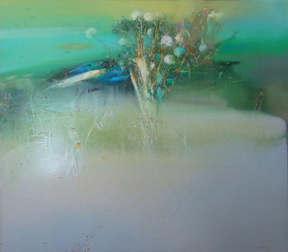 Картина работает как живописная медитация, где взгляд не фиксирует предмет, а постепенно «растворяется» в глубине цветовых потоков. Это точка, где пейзаж становится чистым состоянием, где нет горизонта. Но есть чувство, что он существует и форма растворяется в цвете как чувство памяти и сна.