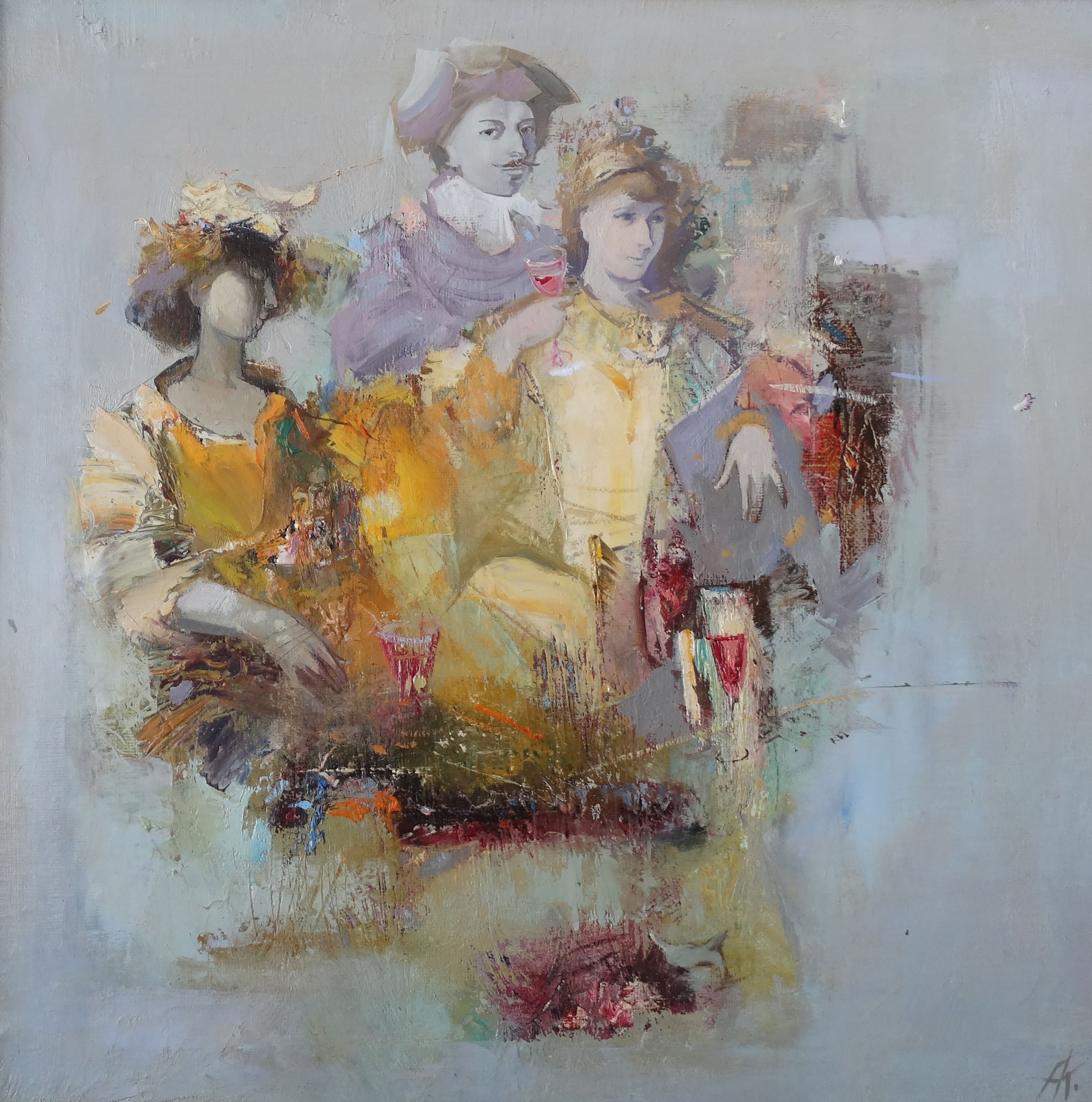«Воспоминания» — камерная, интимная композиция, где фигуры словно возникают из туманного облака памяти. Мягкое сфумато растворяет границы между персонажами и пространством, превращая сцену в поток воспоминаний. Колорит построен на золото-охристых и жемчужных оттенках, перекликающихся с ранними «золотыми» циклами художника. Перед нами не конкретный сюжет, а ощущение — хрупкое, мерцающее, только что всплывшее из глубины времени. «Воспоминания» — важная работа рубежа столетий, отражающая переход Анатолия Гавриловича Костяникова от театрализации пространства к философской рефлексии темы памяти. Композиция основана на взаимодействии трёх фигур, которые существуют в пространстве не реального времени, а внутреннего переживания.