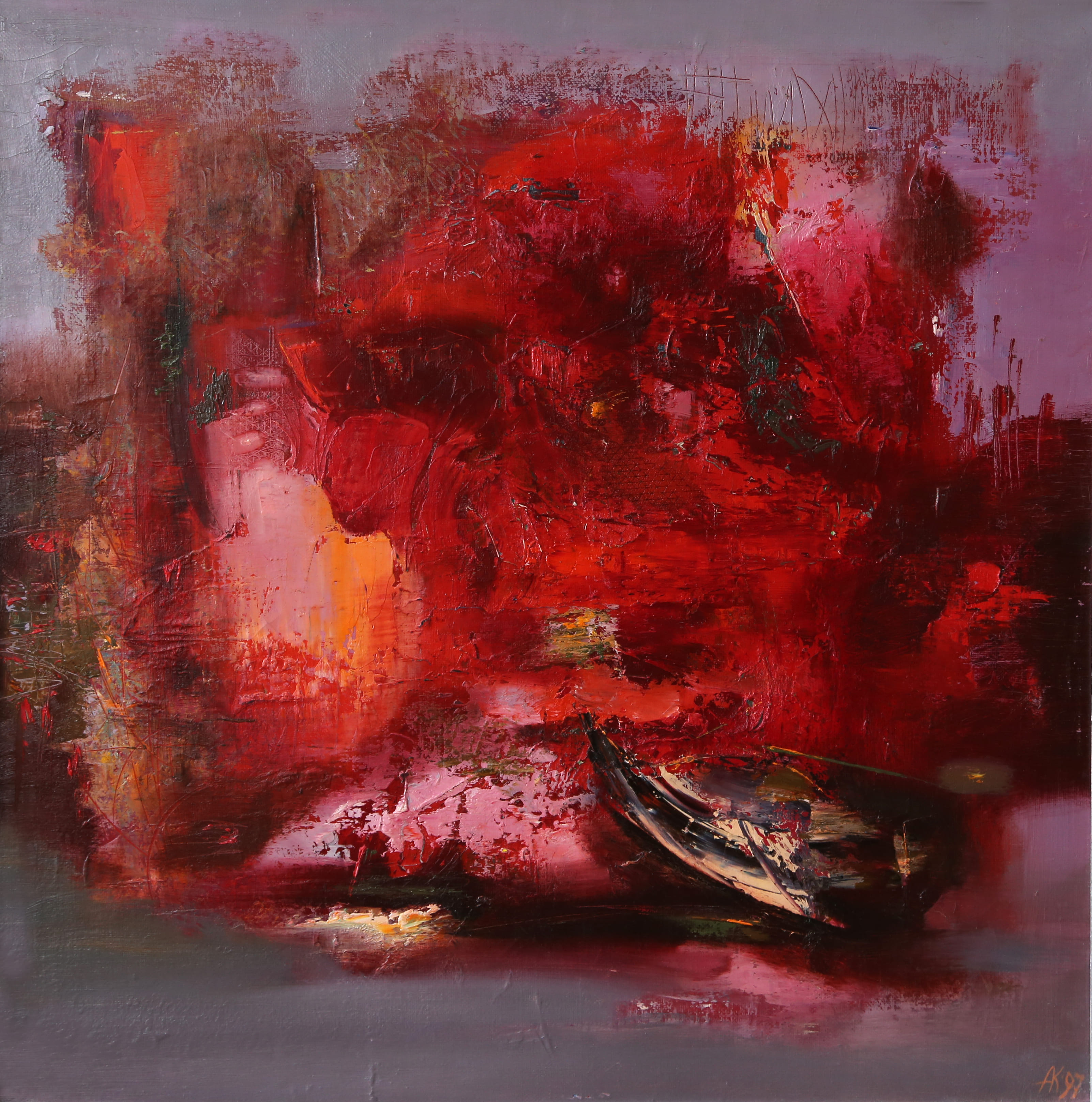 Картина Анатолия Костяникова «Клеопатра» представляет собой образ-аллюзию, где исторический персонаж осмысляется не через фигуративность, а через напряжённое цветовое поле. Доминирующая красная палитра, насыщенная тёмными и светящимися оттенками, формирует образ власти, страсти и чувственности. Произведение выстраивается как эмоциональный портрет, в котором колорит и структура заменяют сюжет, переводя образ в плоскость цвето-символического мышления. Структура картины многослойна. Плотные пастозные мазки чередуются с протёртыми, почти прозрачными участками. Это создаёт ощущение археологического слоя — словно образ проступает сквозь время. Поверхность холста активно «работает», вовлекая зрителя в тактильное восприятие.