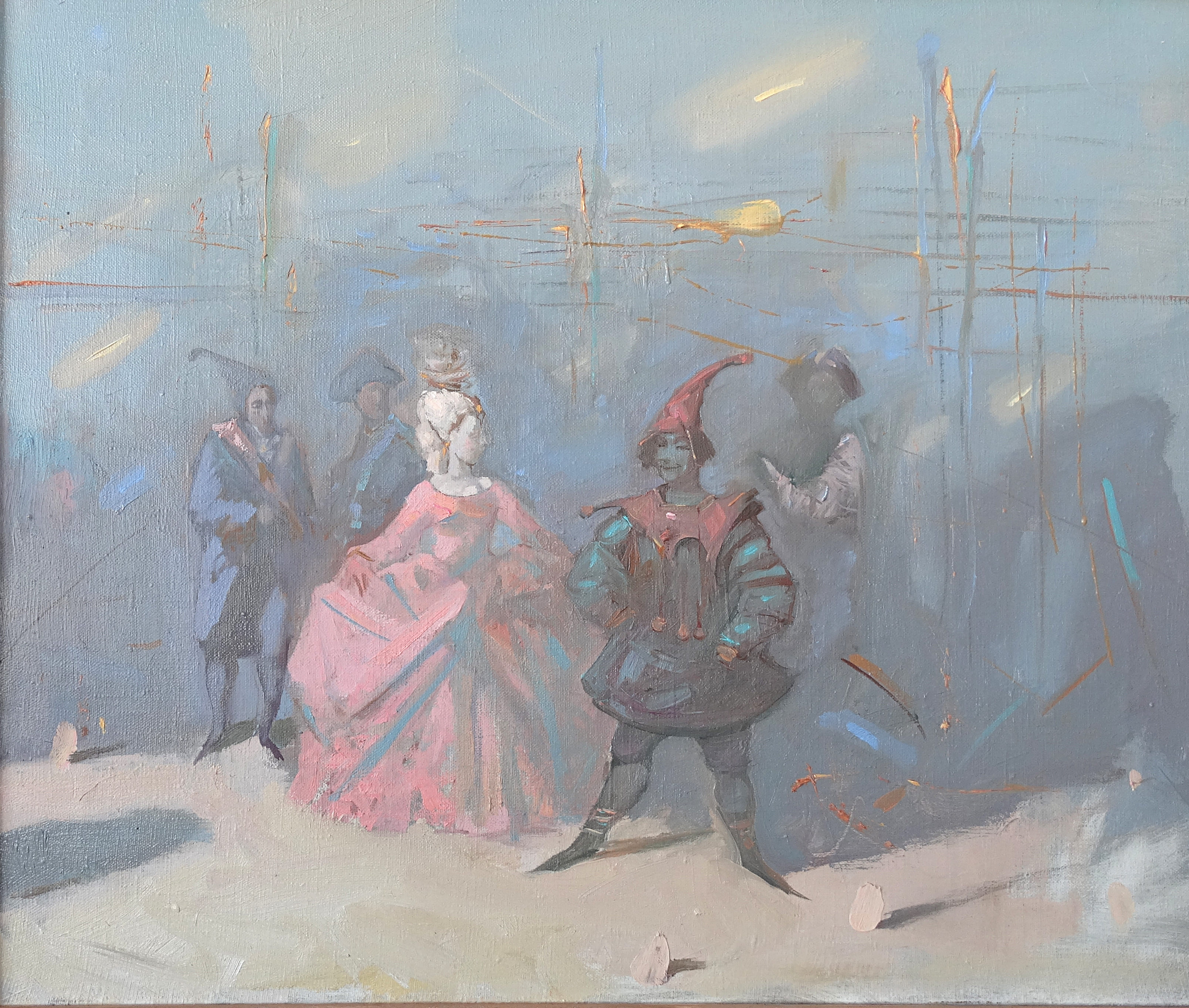В картине «Принцесса и шут» Анатолий Гаврилович Костяников продолжает разработку своего «театрального цикла», объединяющего образы масок, придворных костюмов, артистических поз и неопределённых пространств, напоминающих одновременно сцену и сон. Композиция выстроена вокруг контраста двух фигур: светлой, тонко моделированной принцессы и более плотного по форме шута, который становится центром композиционной устойчивости.