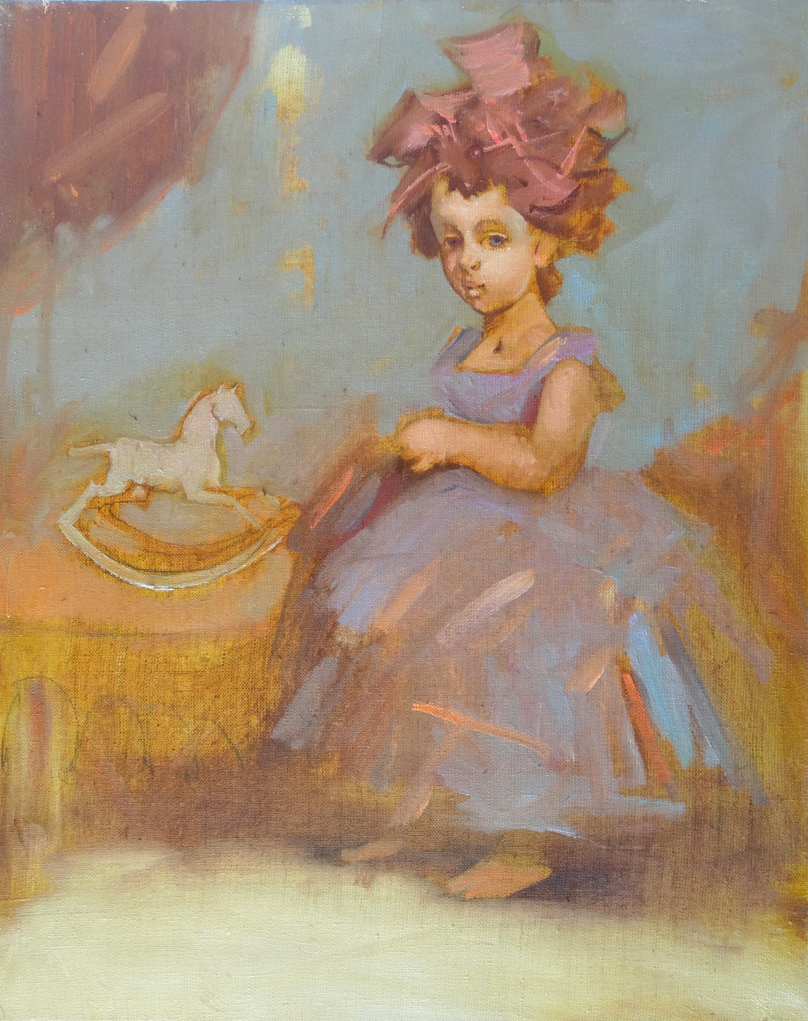 «Игрушка» — тонкая и трогательная работа Анатолия Гавриловича Костяникова, в которой реальность и детская фантазия плавно перетекают друг в друга. Девочка с пышным розовым бантом и деревянной лошадкой становится центром тихой интимной сцены, а сфумато — размытый фон превращает пространство в мягкую атмосферу воспоминания о детстве. Картина сочетает нежный колорит, сложную композиционную структуру и характерный для Костяникова поэтический символизм. Картина построена на принципе интимного психологического портрета, где фигура ребёнка служит медиатором между видимым и воображаемым. В «Игрушке» художник раскрывает тему детства как сакрального пространства, где предметы приобретают символический смысл, а окружающая среда превращается в зыбкое поле внутреннего света. Девочка с игрушечной лошадкой предстает в состоянии тихого созерцания, а сфумато-фон формирует атмосферу ностальгической памяти, создавая уникальный мир тонкой поэзии и философской глубины.