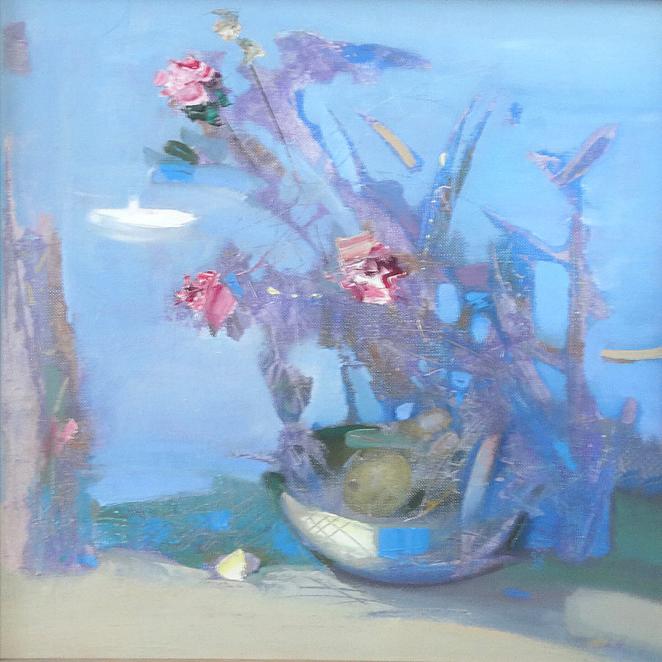 «Натюрморт на фоне моря» — созерцательная и философски насыщенная работа, в которой традиционный жанр натюрморта расширяется до образа границы между устойчивым и текучим. Через мягкую пастельную палитру, сложную многослойную живопись и размытое сфумато художник соединяет предметный мир с бесконечным морским пространством, превращая композицию в метафору памяти, времени и хрупкого равновесия бытия.