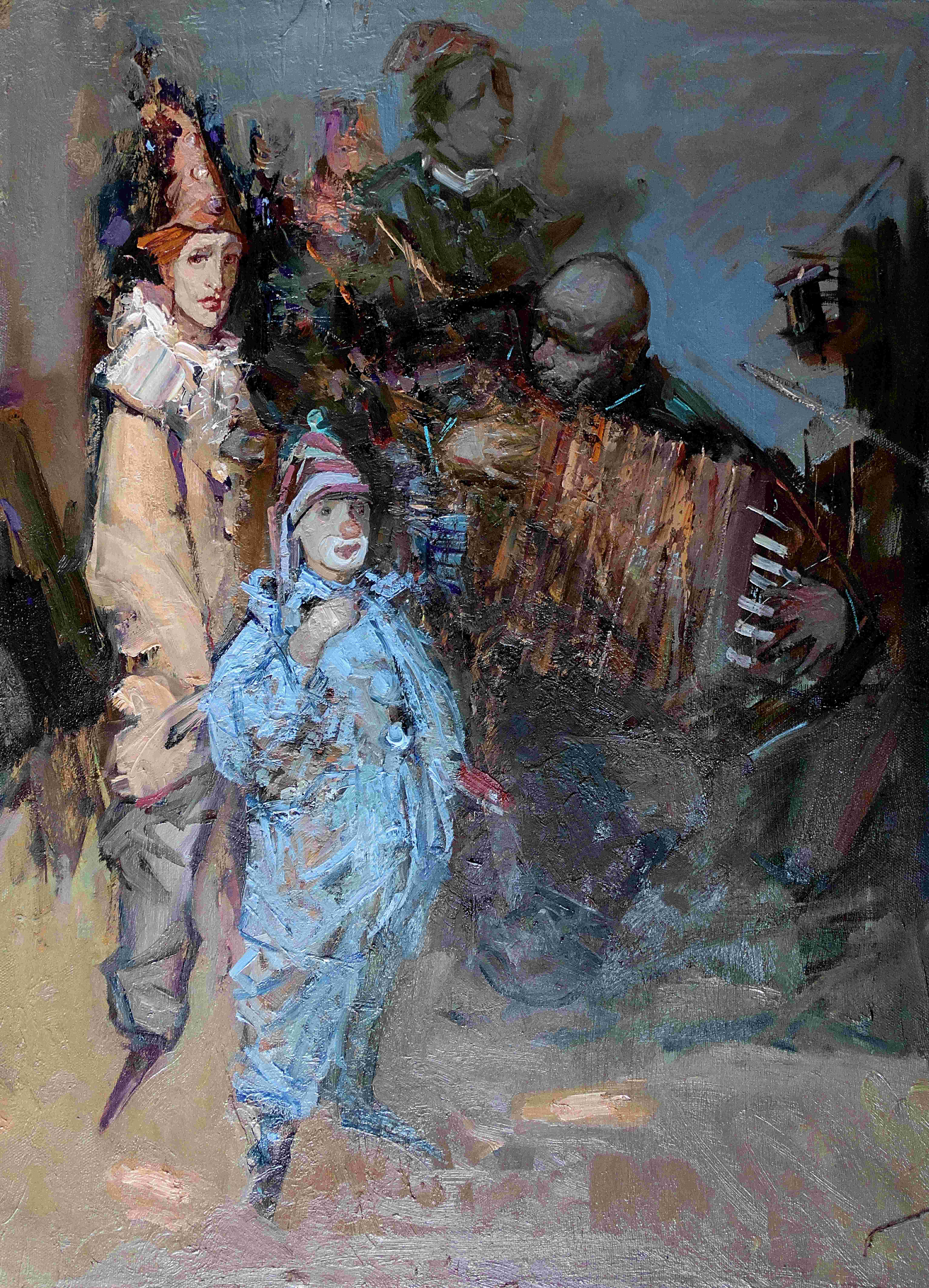 Одна из работ фигуративного цикла, в которой художник раскрывает тему психологизма персонажей. Это не цирк и не шапито. Это фрагмент реанимированной памяти детства. Клоуны, музыканты, пилигримы — персонажи, которые встречаются в работах автора ещё с 1990-х — «Музыканты» (1994), «Дуэт» (1992), «Тихая мелодия» (1993). Данная композиция принципиально лишена нарративной завершённости. Она строится как структурное поле, в котором фигуры, предметы и фон не противопоставлены друг другу, а находятся в состоянии взаимопроникновения и внутреннего равновесия.