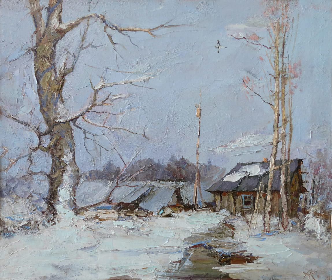 Картина «Деревня» представляет собой пример зимнего пейзажа Костяникова, выполненного с характерной для него живописной свободой. Композиция строится на диагональном развороте пространства: массивное дерево слева формирует устойчивую вертикаль, в то время как линия крыш и дорога мягко уводят взгляд вглубь. Тишина здесь не отсутствие звуков, а спокойствие мира, которое можно потрогать на кончике кисти.
