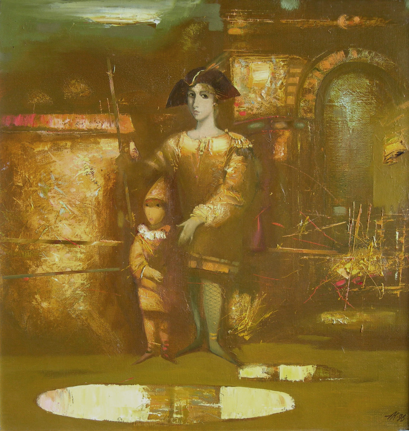 «Ночной дозор» — лирико-символическая картина Анатолия Костяникова, в которой сюжет ночной стражи переосмыслен как образ внутреннего бдения и духовного внимания. Произведение о бдительности духа, о хранении внутреннего света среди тишины и темноты. Это картина о ночи, которая не пугает, а раскрывает новые смыслы, превращаясь в пространство перехода, заботы и скрытого знания. Костяников создаёт собственный, поэтический вариант жанра, где сторожевое служение становится метафорой человеческого пути и внутреннего роста. Две фигуры — юный страж и маленький спутник — существуют в золотисто-оливковой среде, наполненной мягким светом и текстурными штрихами, создающими эффект мерцания.