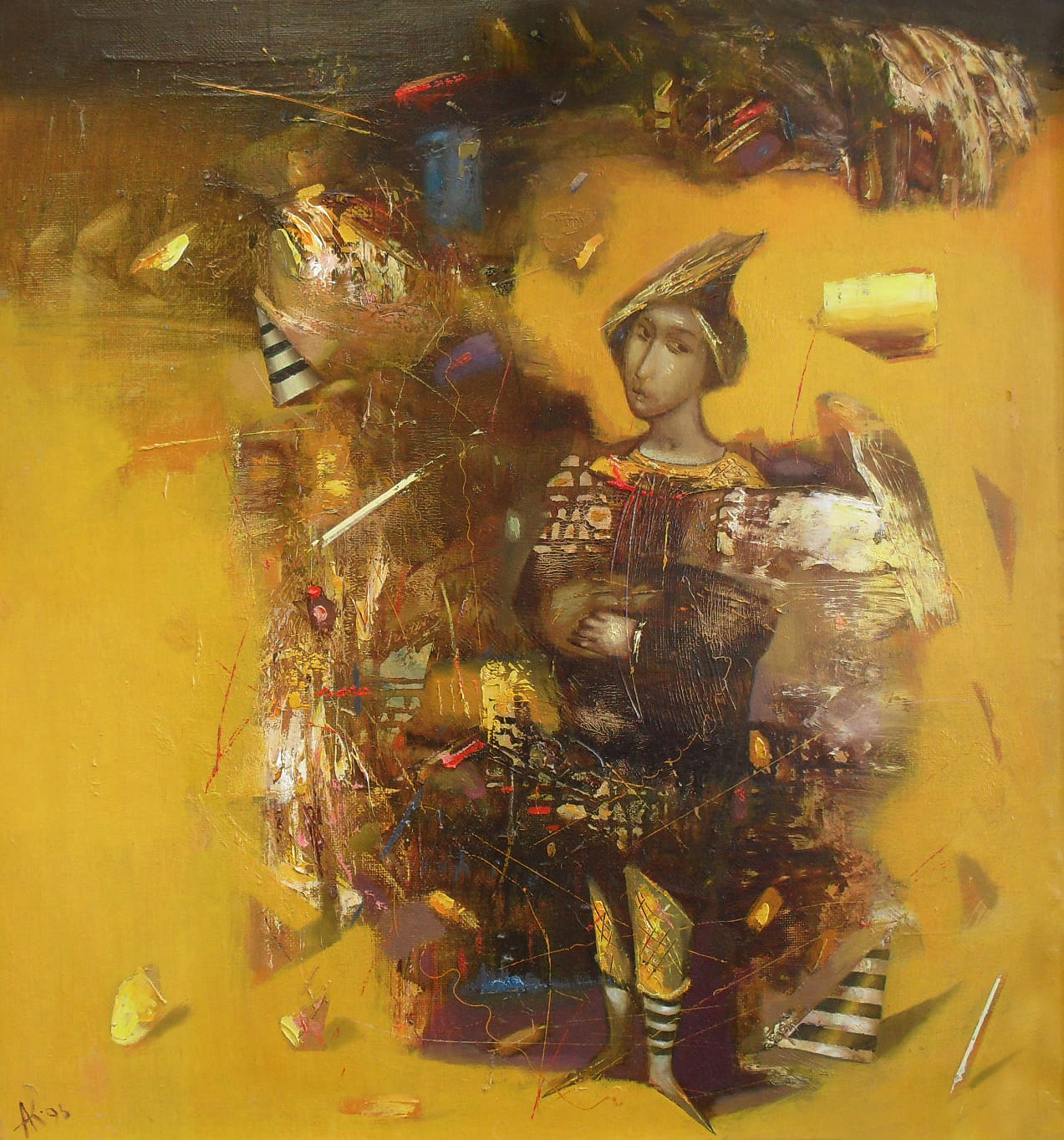 В работе «Под знаком Тельца» Анатолий Гаврилович Костяников обращается к архетипам земли и времени. Фигура, возникающая из плотного золотого фона, становится метафорой накопленной энергии и устойчивого существования. Колорит, построенный на тёплых охристых и золотых тонах, в сочетании с мягким сфумато и сложной структурой живописи формирует образ, в котором знак зодиака трансформируется в философскую категорию, аллегорический образ земного начала, устойчивости и телесной укоренённости бытия.