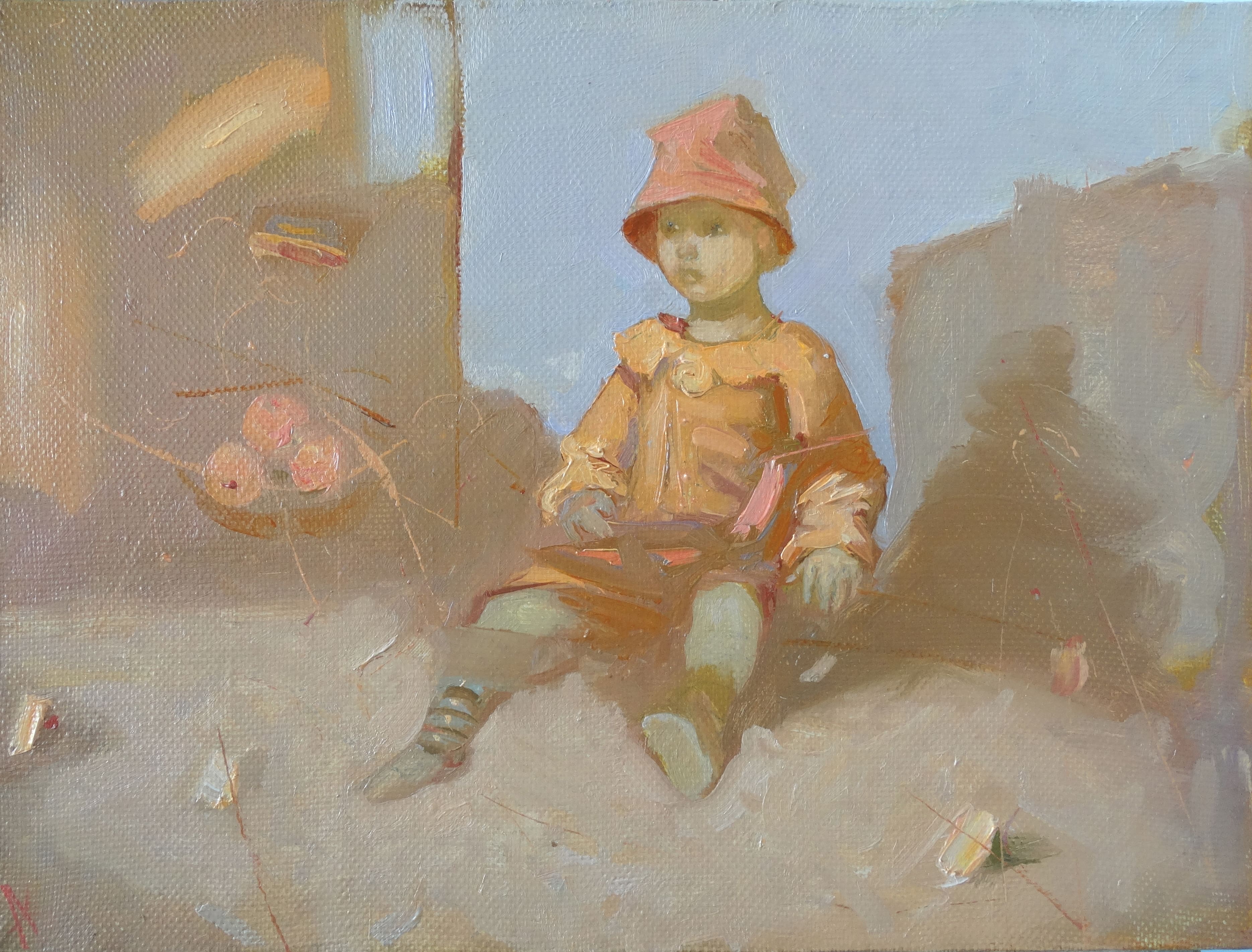 Камерная работа Костяникова, в которой фигура, застывшего в тени полуденного света, становится центром тихого, почти расплавленного воздуха. Смягчённый задний план, растворённый в тепле и дрожащем мареве, превращает обыденный сюжет в поэтическое размышление о летней неподвижности и хрупкости детского мира. Художник намеренно избегает жёстких границ, превращая фон в атмосферу, в которой растворена детская фигура. Эта работа продолжает авторскую тему детства как пространства внутреннего переживания, а не бытовой конкретики. «Жаркий день» — важное произведение в ряду работ Костяникова, обращённых к миру детства и к состояниям человеческой чувствительности. Эта картина, на первый взгляд, выглядит как лёгкая этюдность, однако, в ней кристаллизуется глубокая авторская поэтика.