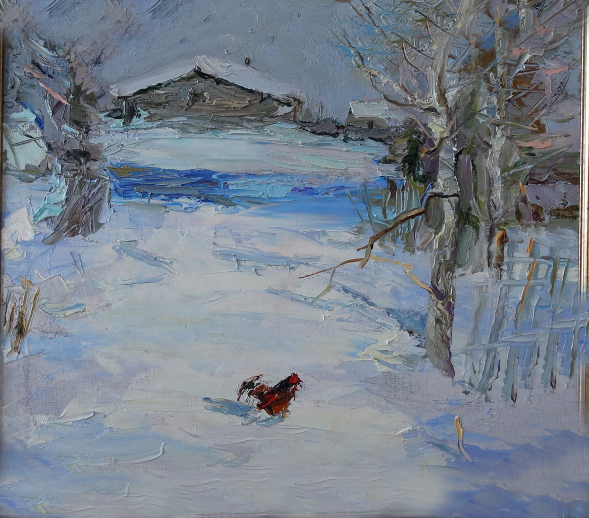 «Январский день» — одно из наиболее выразительных произведений зимней серии Костяникова. Картина создана на основе мощной пастозной фактуры, где текстурные штрихи формируют рельеф деревьев и плотность снега. Это не просто фиксация зимнего пейзажа, а образ состояния: тихого, ясного, немного хрупкого. Картина объединяет реальное и поэтическое, создавая пространство созерцательного спокойствия и ярким тепловым акцентом — фигурой красного петуха, который оживляет пейзаж и задаёт эмоциональное дыхание всей композиции. Работа демонстрирует тонкое чувство света и природы русской деревни, превращая простой мотив в поэтическое живописное состояние.