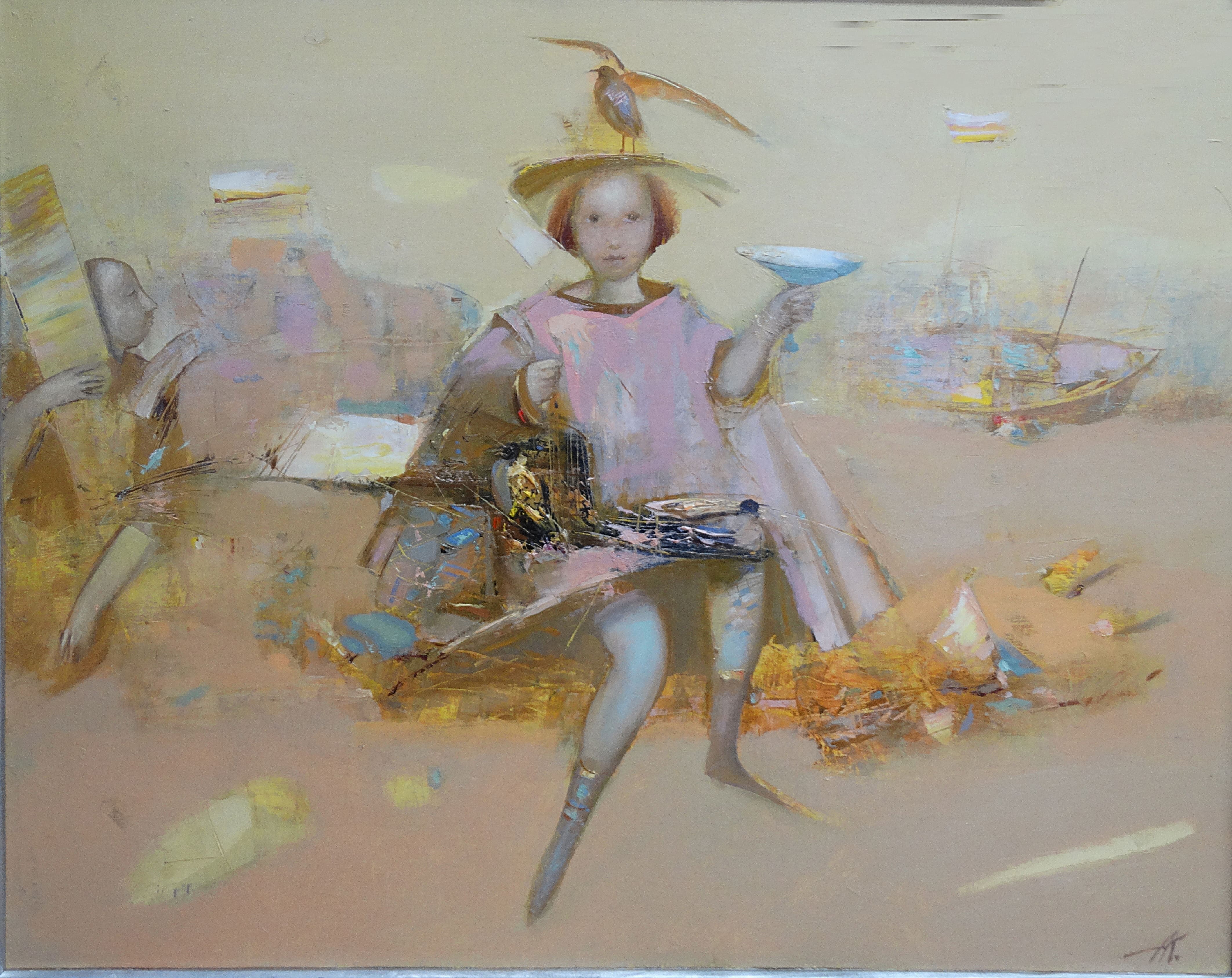 «Праздник у моря» — тонкая и светлая композиция Анатолия Гавриловича Костяникова, где детская фигура становится главным носителем смысла. На фоне условного морского пространства появляются лодки, флаги и крошечные архитектурные намёки, создавая атмосферу торжественного. Картина сочетает фигуративные мотивы с абстрактными переливами, превращая сцену в поэтическое видение памяти и игры.