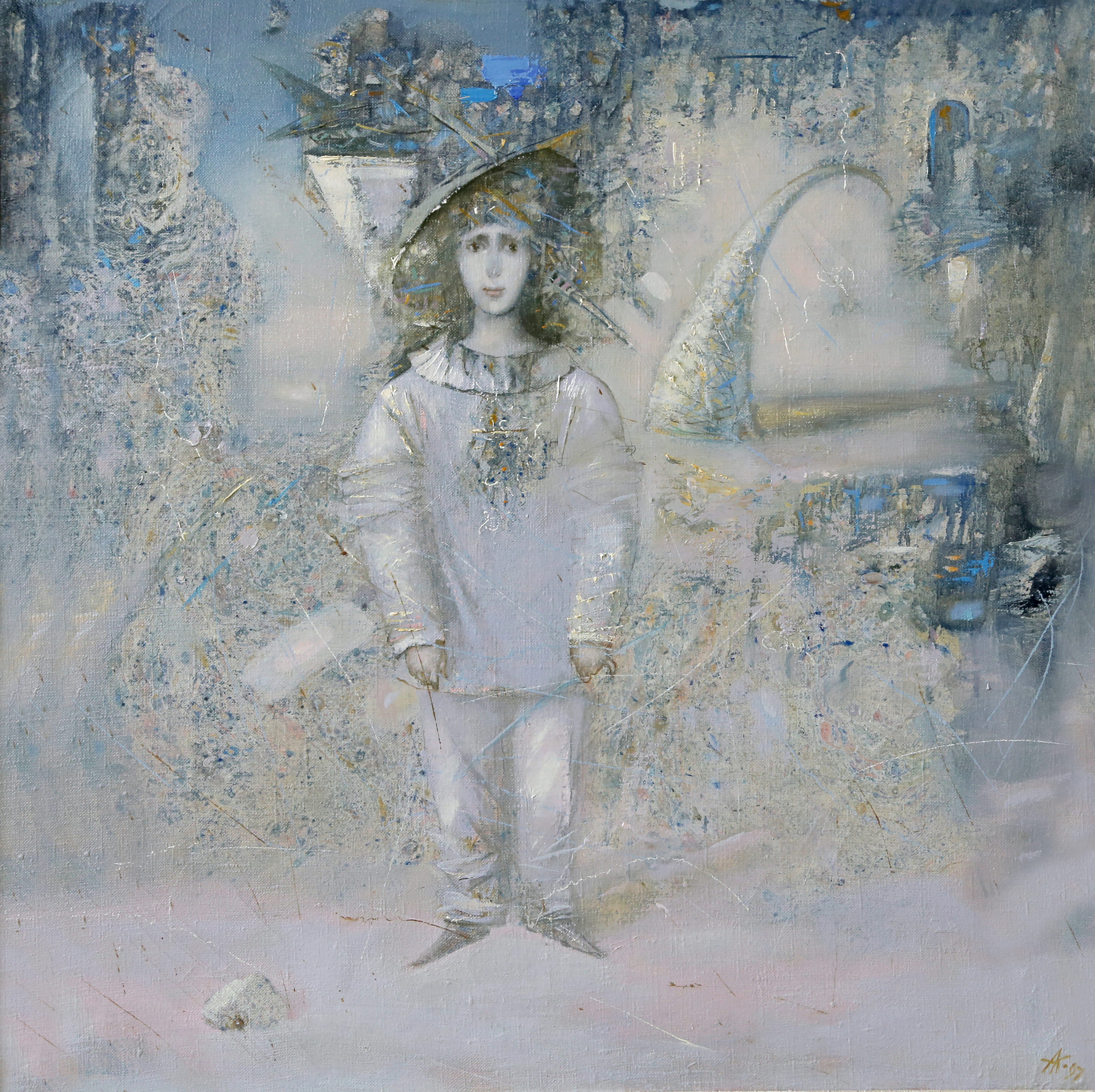 «Пилигрим» — одна из знаковых работ Анатолия Гавриловича Костяникова конца 1990-х, где образ странствующего юноши возникает в сверкающем, почти снежном серебристом мире. Фигура словно соткана из света и тишины, а задний план напоминает одновременно древний город, мифологический ландшафт и пространство памяти. Картина объединяет мотивы пути, духовного поиска и существования между реальностью и сновидением. Центральная фигура — юный пилигрим, изображённый фронтально, почти иконно, в мягком серебристо-лунном свете. Он не движется, но вся композиция построена вокруг его готовности к пути. Его шляпа с асимметричным полем, рубашка-плащ, светящаяся отделка — не детали костюма, а символы пути и внутренней собранности. Пилигрим у Костяникова становится образом человека, вступившего в пространство, где материальное растворяется в духовном. Картина принадлежит к наиболее глубоким, насыщенным смыслами произведениям Анатолия Гавриловича Костяникова и выстраивает образ человека, у которого дорога не снаружи, а внутри, наполненная чистотой и светом на пути к себе.