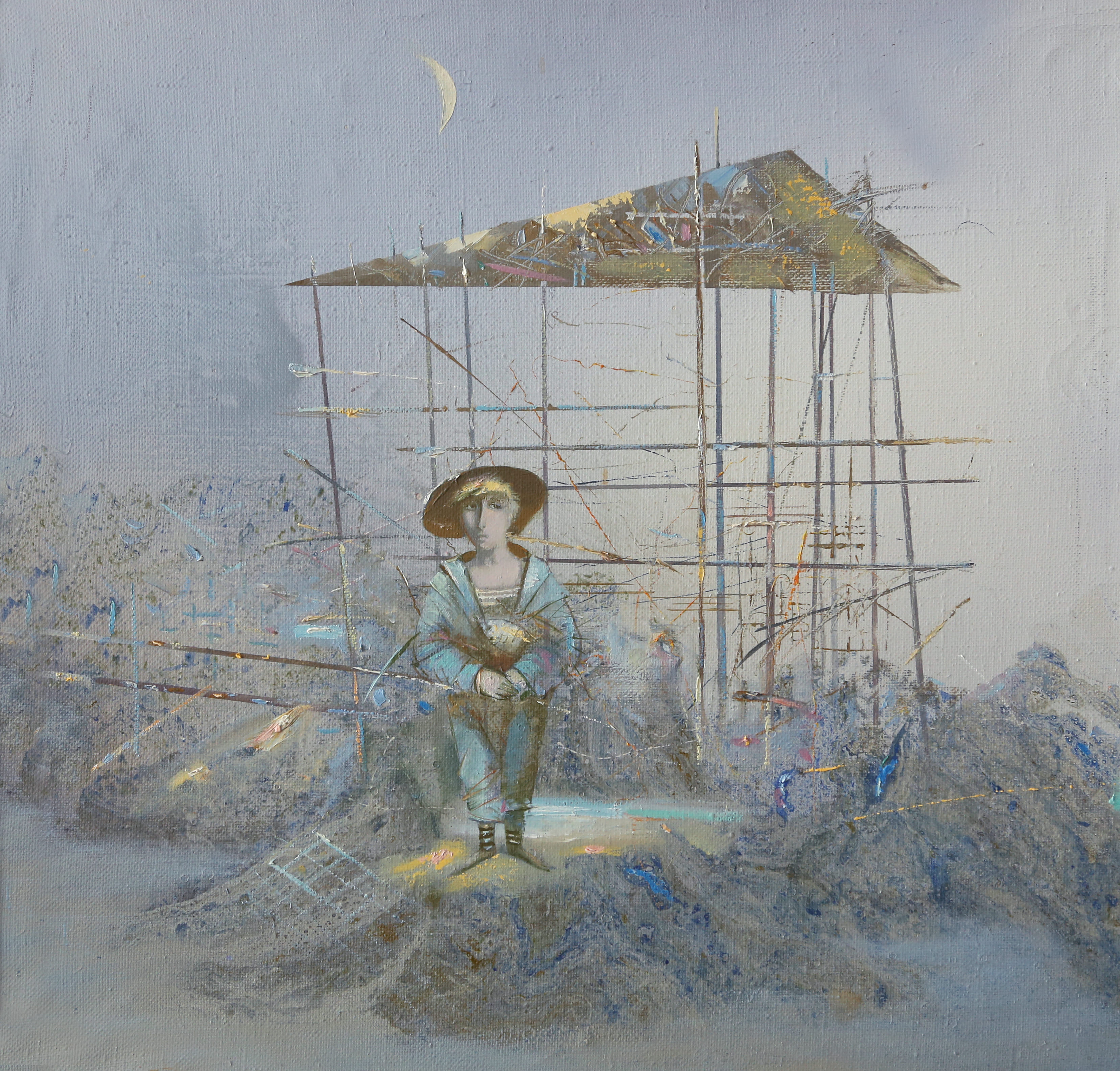 Единственная фигура, погружённая в сложную систему линий и конструкций, напоминает романтического путника, оказавшегося в пространстве между мечтой и реальностью. Серебристая гамма, мягкая и сетчатая структура заднего плана создают атмосферу созерцания, внутреннего движения и тишины.