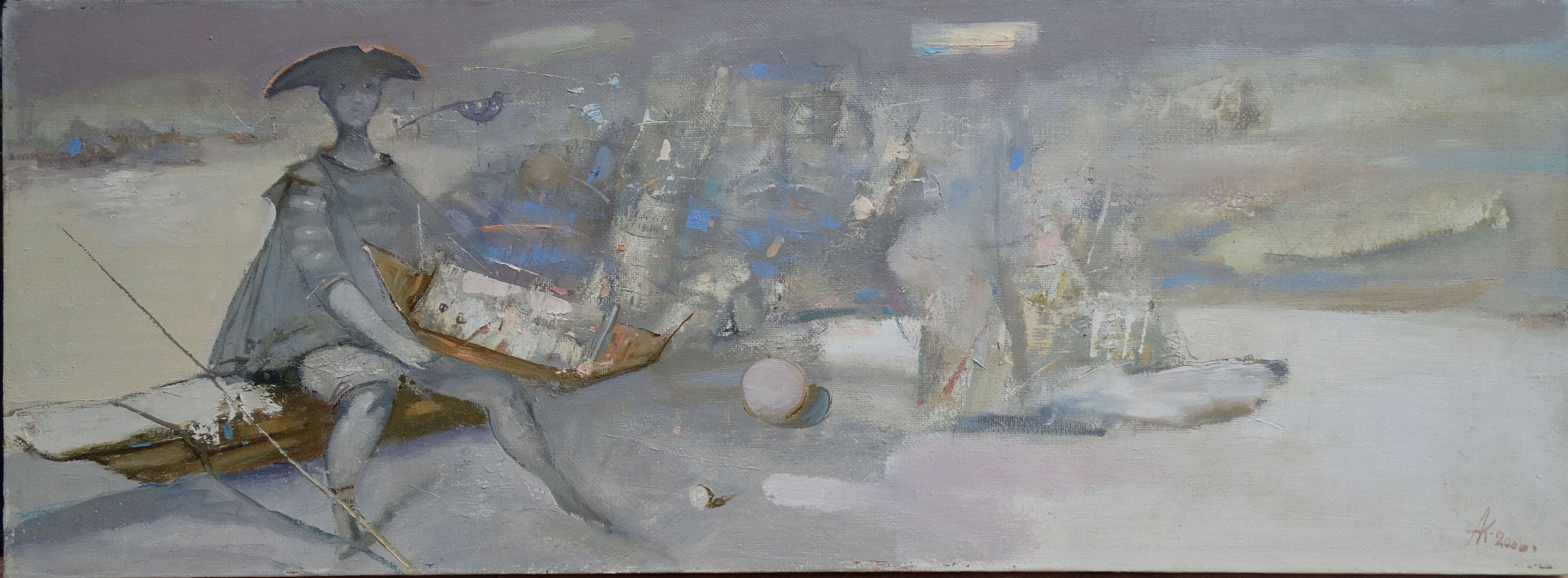 Центральная фигура располагается на длинной горизонтали, подчёркивающей эпизодичность и протяжённость времени. Ной представлен не как величественный пророк, а как скромный персонаж тихой, погружённой в медитацию сцены. Он держит в руках ковчег — не гигантский корабль, а его уменьшенный, метафорический двойник, словно игрушечную модель будущего спасения. Такое решение формирует параллель с визуальной традицией самого Костяникова — мир его персонажей часто напоминает театральные «малые миры», построенные по законам внутренней логики художника.