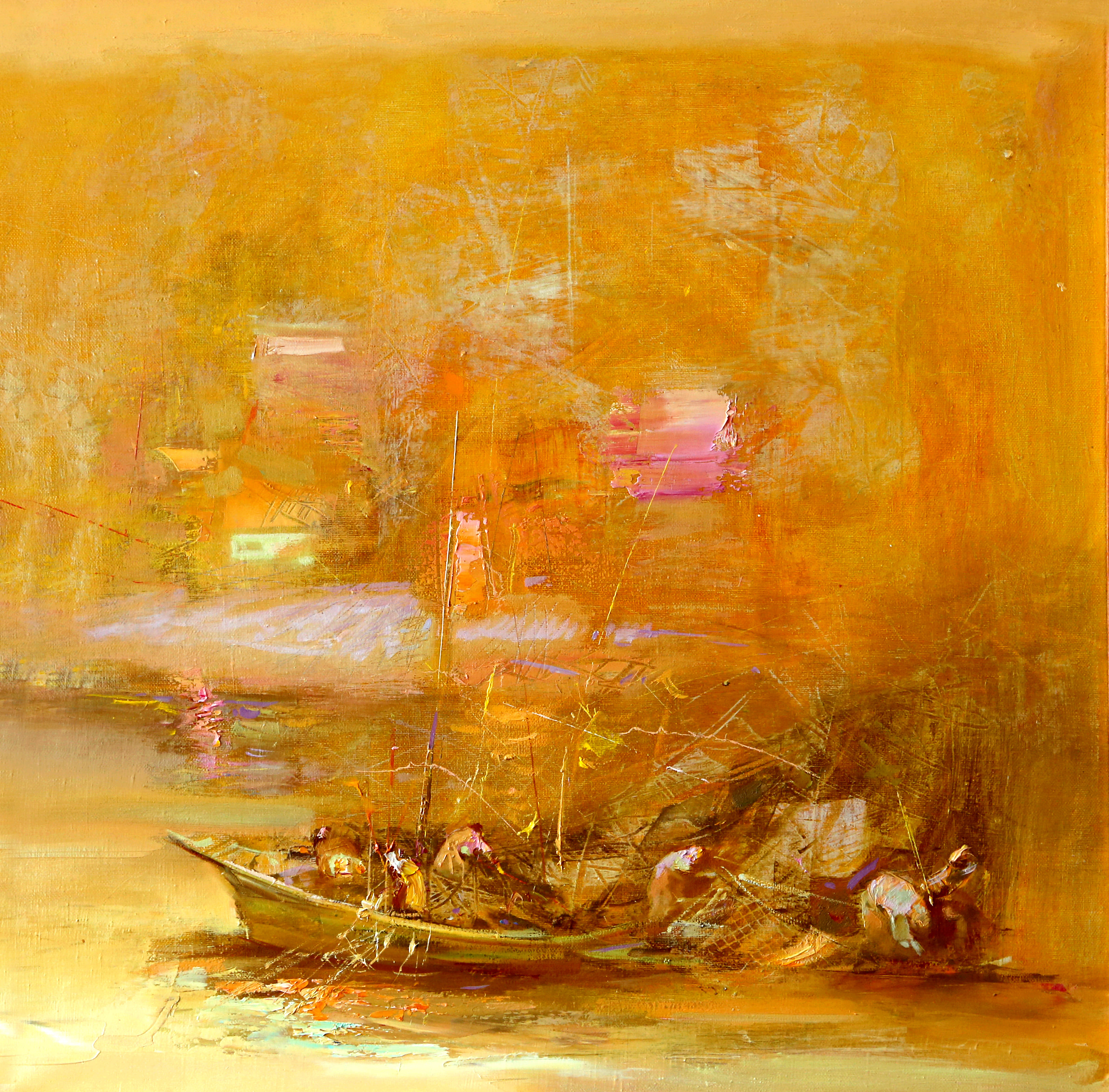 Основное пространство картины — это стихия света. Тёплый золотой фон становится главным выразительным элементом: он окружает лодку, окутывает пространство, образует почти физически осязаемую атмосферу. Здесь свет не освещает, а живёт собственной жизнью: он колышется, мерцает, пульсирует. Этого художник достигает сложной техникой: подмалёвок, прозрачные слои, тонкие царапины, пластические размывы и локальные пастозные пятна собираются в «световой оркестр». Задний план наполнен несколькими уровнями абстракции. В нём можно разглядеть намёк на отражения воды, возможно, очертания зданий, отблески искусственного света. Но все эти формы растворены в процессе живописи. Автор стремится не к передаче конкретного пространства, а к созданию впечатления погружения в золотую среду — в сумеречный туман, наполненный остаточным сиянием заката.