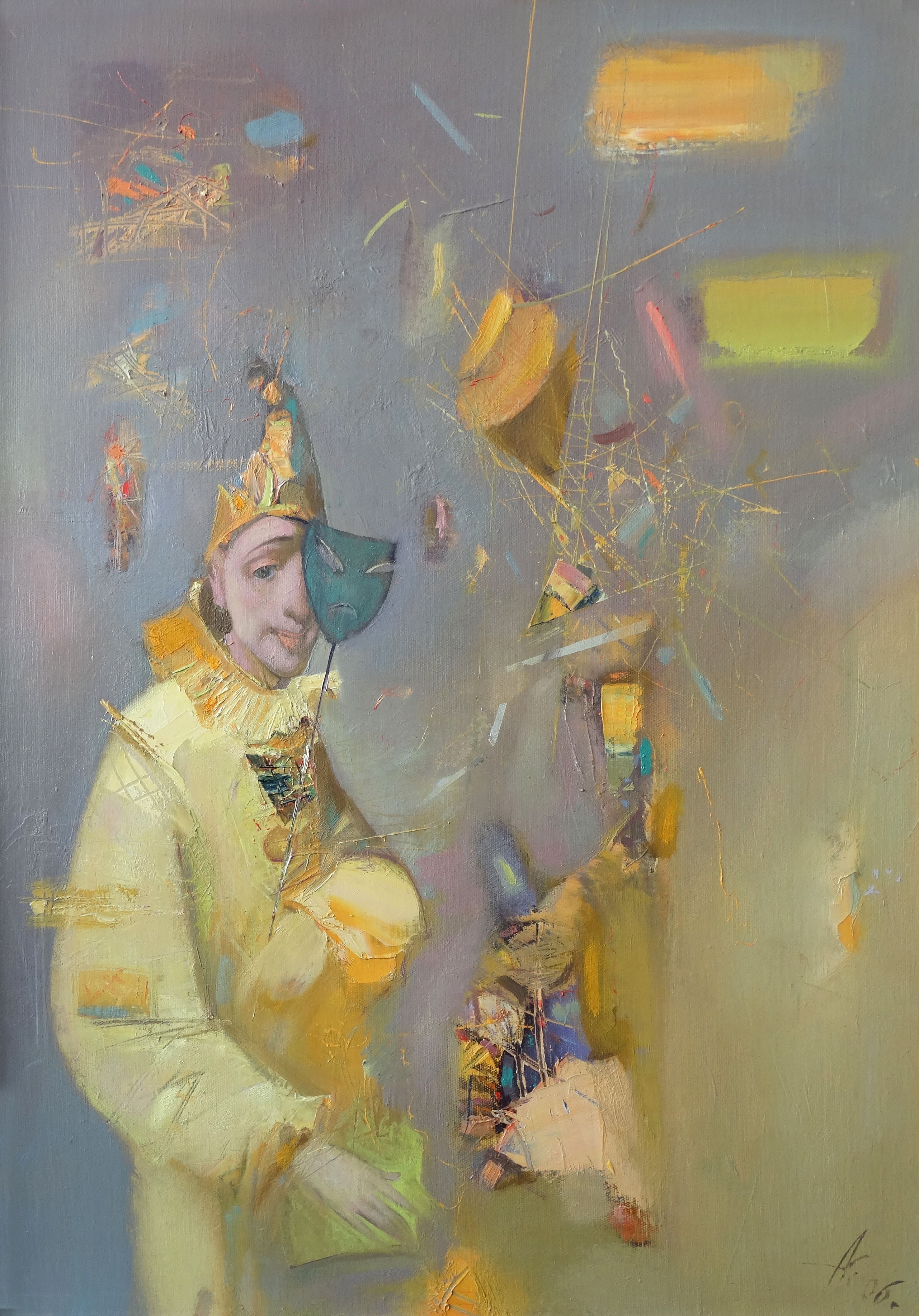 Произведение «Клоун с маской» занимает важное место в цикле работ Анатолия Костяникова, посвящённых театральному образу как универсальному символу человеческого существования. Палитра картины построена на приглушённых серо-жёлтых и опаловых тонах, создающих мягкий, почти акварельный колорит. Применённый художником приём сфумато сглаживает границы между фигурой клоуна и вибрирующим пространством фона, превращая композицию в единый организм.