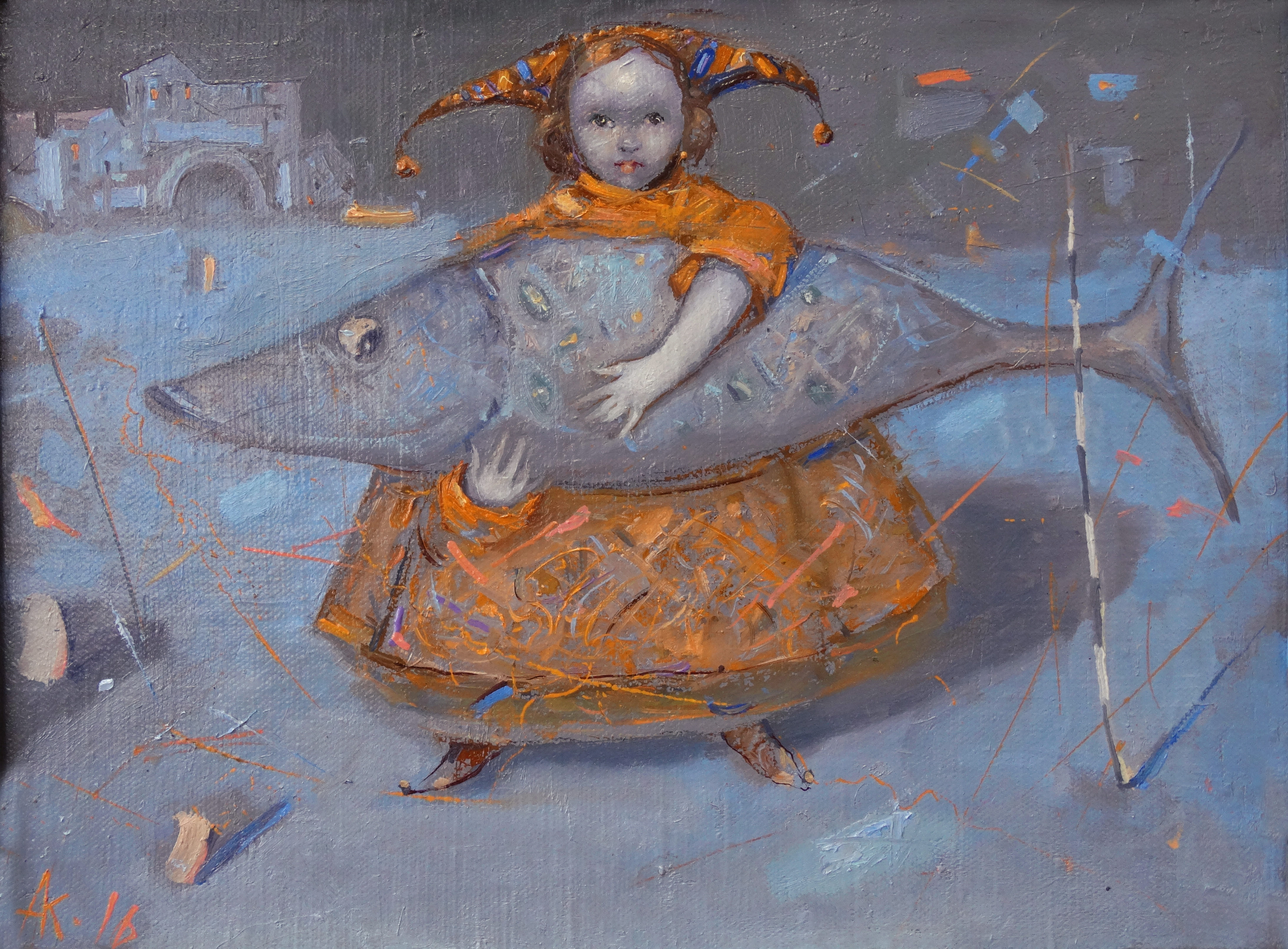 В центре — фигура девочки-арлекина, держащей непропорционально большую рыбу.