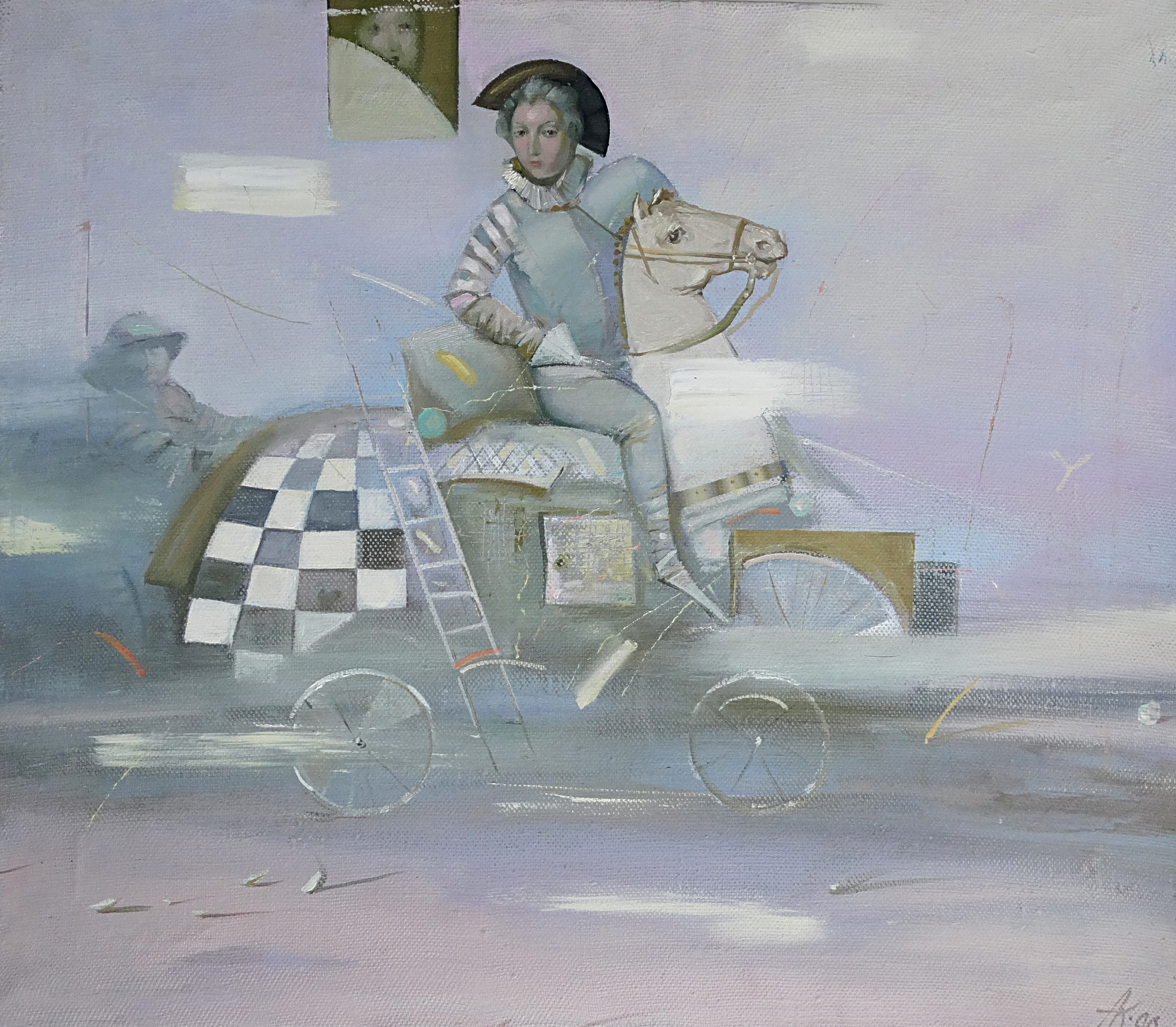 Картина «Наездник» представляет собой философскую аллегорию движения. Образ персонажа, помещённого на гибридную конструкцию — между конём и колесницей — раскрывает характерную для Костяникова тему театральности, существующей в пространстве сна, памяти и культурных цитат. Работа сочетает утончённый колорит, сложную структуру и многослойную композицию, в которой фигура человека оказывается не столько доминантой, сколько включённой в общую структуру композиции. «Наездник» тесно связан с образами из циклов «Пилигримы» и «Игра в императора». Как и фавориты, клоуны, пилигримы, этот персонаж лишён пафосного начала, находится в промежуточном состоянии, существует между явью и мифом.