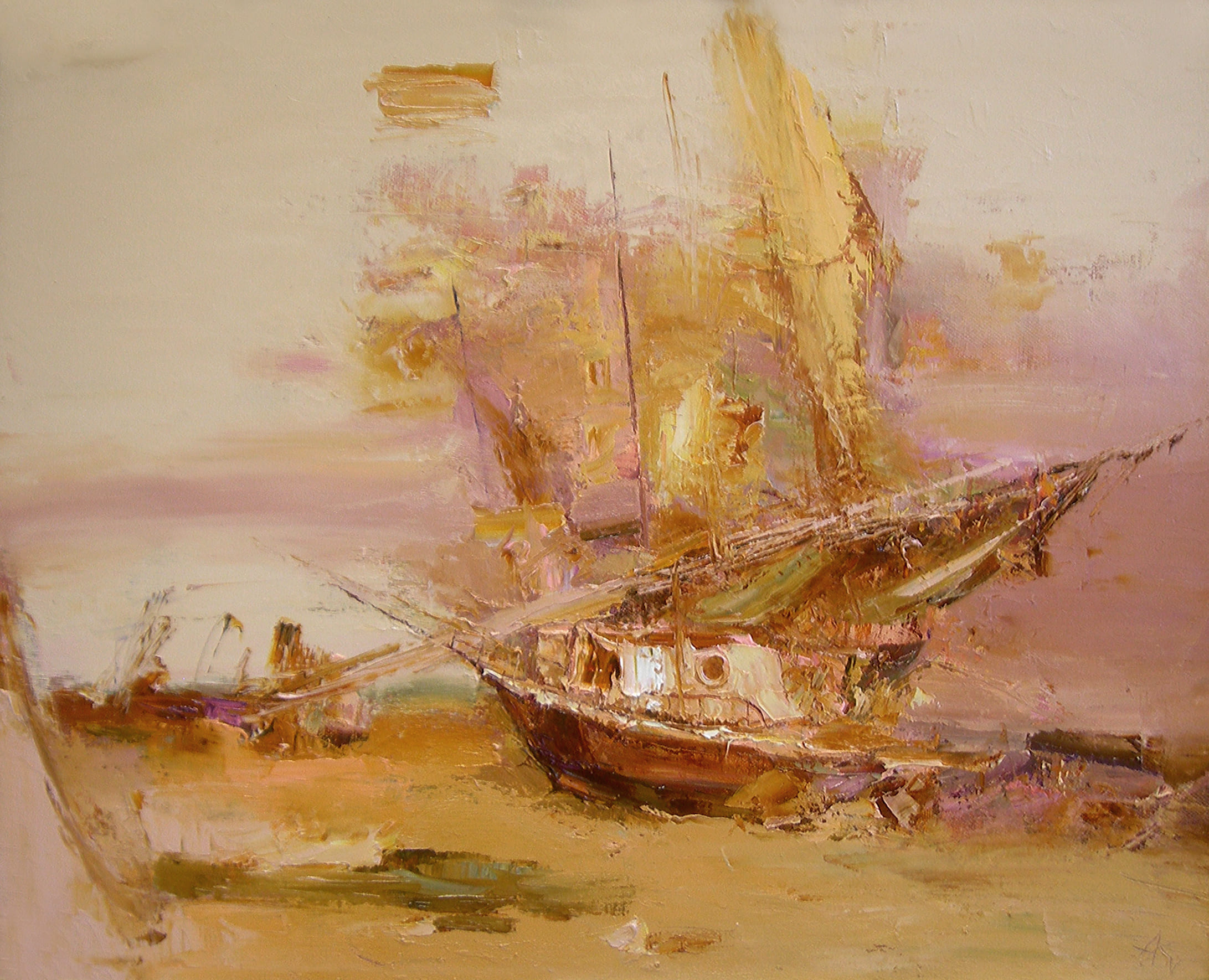 «На песчаной косе» — живописная медитация о границе земли и воды, покоя и движения. В картине Анатолия Гавриловича Костяникова парусная лодка становится символом пути, остановки и ожидания. Колористическая гамма выдержана в теплых песочно-розовых тонах, создающих эффект сфумато и легкой мистической дымки. Композиция построена на мягком растворении предметов в пространстве, где реальность и видение соединяются в едином пластическом образе. В картине «На песчаной косе» Анатолий Гаврилович Костяников обращается к одному из ключевых образов своей живописи — образу лодки как знака человеческой судьбы. Лёгкая размытость форм, пастельный колорит и эффект воздушного свечения создают ощущение зыбкости и переходного состояния. Композиция объединяет материальность пастозной фактуры и почти абстрактную пластику заднего плана, что делает работу одним из наиболее поэтичных произведений автора начала 2010-х годов и представляет собой характерный пример зрелости художника.