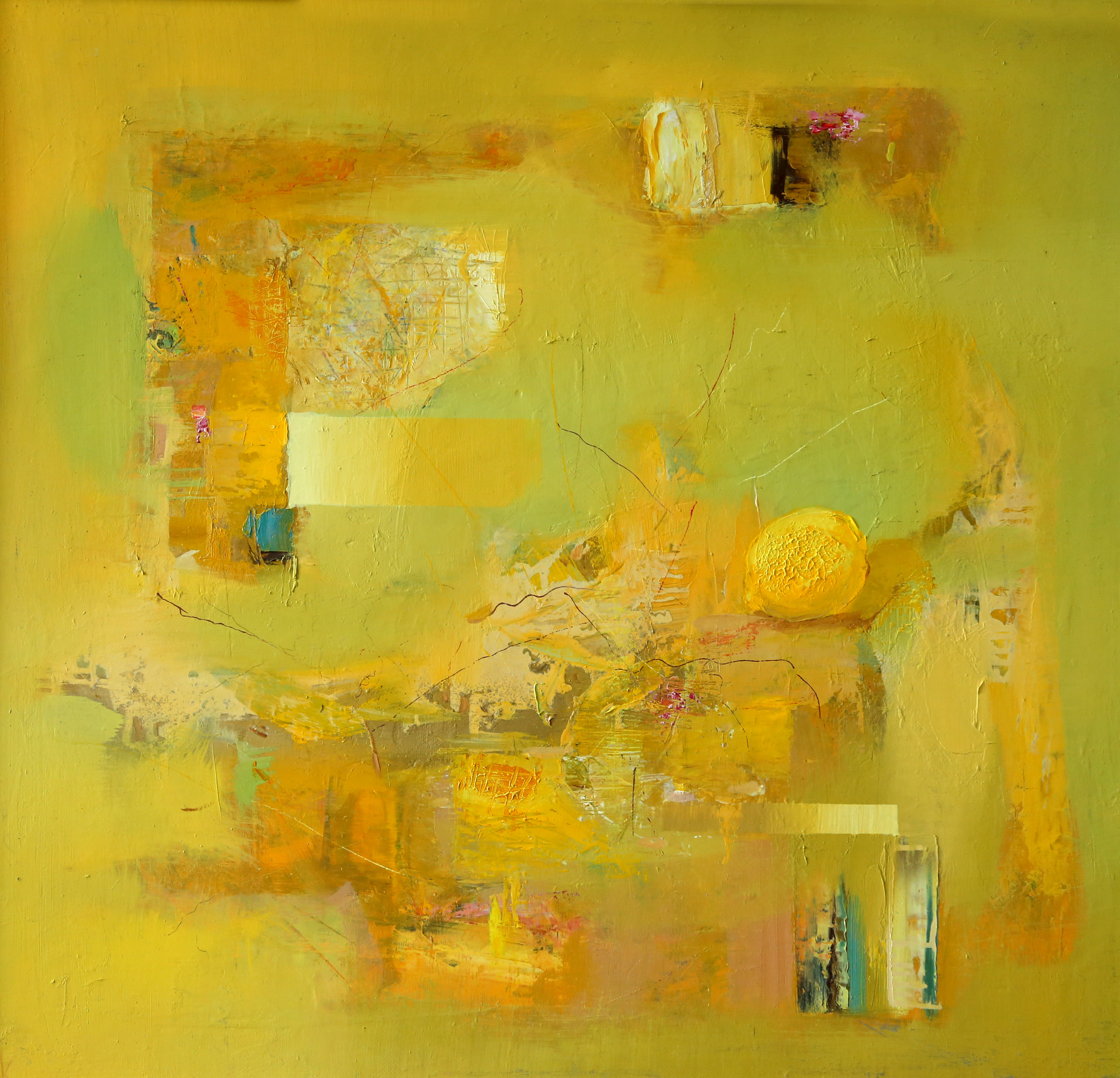 Структура полотна организована вокруг центрального круглого рельефного элемента — желтого «лимона», выступающего из плоскости холста. Он функционирует как цветовой и смысловой центр, вокруг которого вращаются полуабстрактные фрагменты пространства. Пластическая система основана на импровизационной живописной каллиграфии. Задний план написан мягко почти акварельно, но при этом структурирован тонкими графическими вкраплениями. Он не «фон», а атмосферный объём, внутри которого возникает ощущение разворачивающегося движения света. Это отсылает к эстетике Тёрнера, где свет растворяет материальные формы.