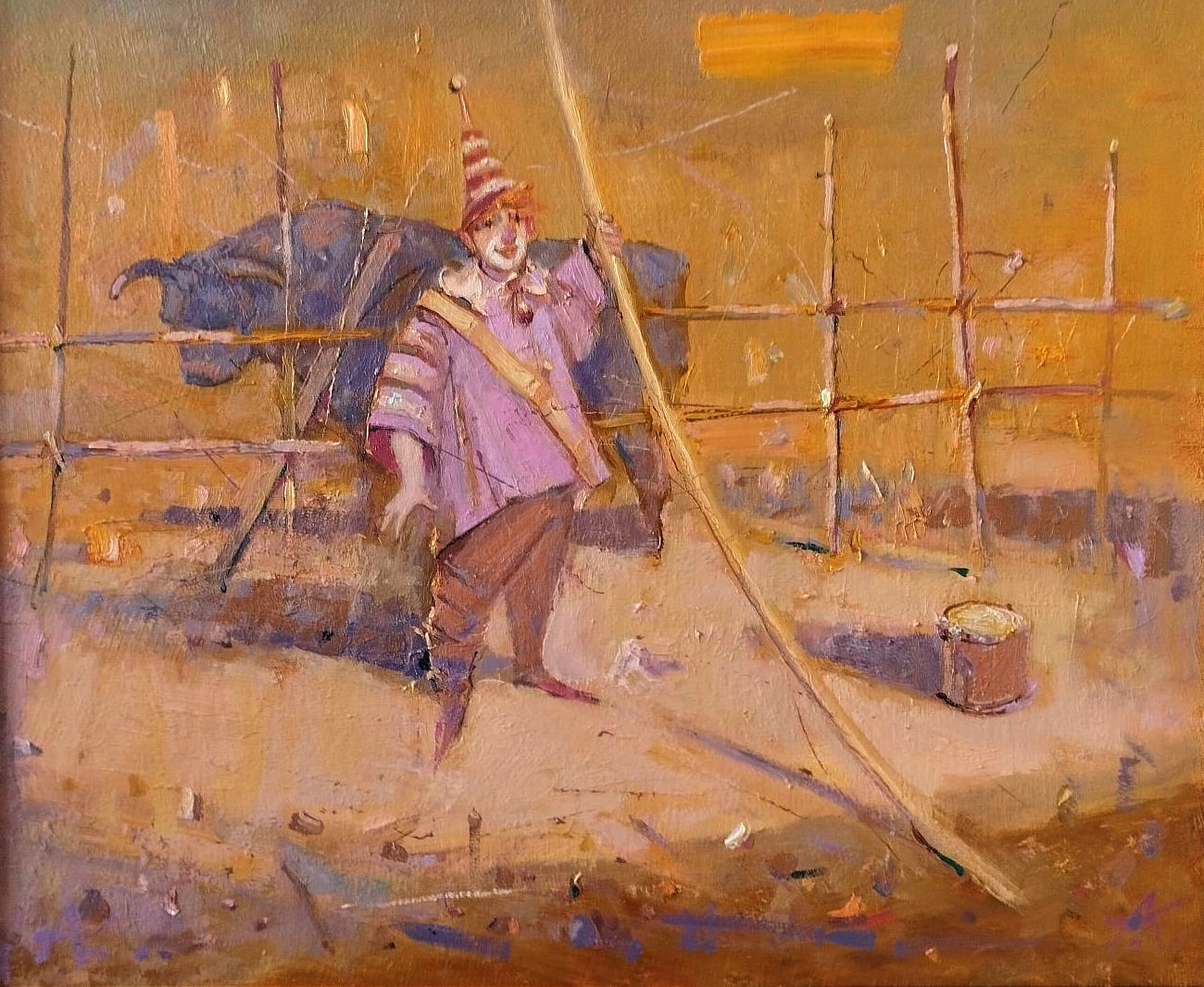 Картина «Укротитель» — философско-аллегорическое произведение, в котором образ циркового артиста превращается в метафору внутреннего усилия, самообладания и хрупкого контроля над бытием. Композиция выстроена к концепции напряжённого противостояния фигуры и пространства, где колорит и структура мазка передают не действие, а психологическое состояние. Фигура укротителя смещена от центра, создавая динамическое равновесие между левым массивом среды и правой свободной зоной. Диагональ шеста организует движение взгляда и формирует композиционную ось напряжения. «Укротитель» — это не сцена цирка. Это метафора человеческого бытия, где каждый находит свой баланс в этом сложном мире.