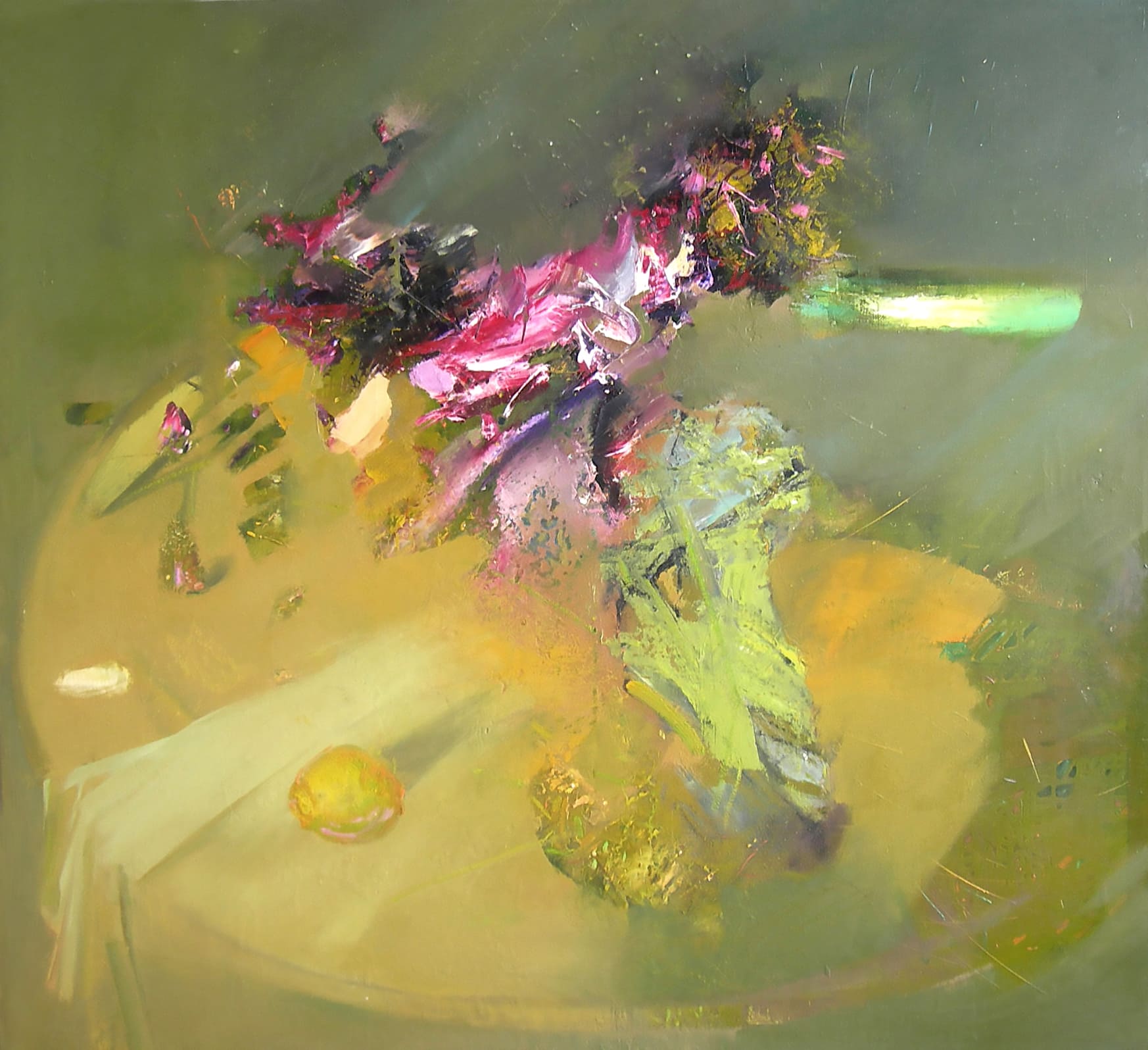 Композиция строится на диагональных движениях. Центральная зона насыщена цветовой и фактурной энергией, в то время как края холста растворяются в мягком, обволакивающем фоне. Такая структура создаёт эффект пульсации пространства, где нет чёткого разделения между передним и задним планом. Произведение представляет собой философское осмысление жанра натюрморта, в котором предметный мир трансформируется в динамическое поле цветовых и пространственных взаимодействий. Работа раскрывает характерную для художника живописную медитацию о хрупкости и торжественности бытия. Это натюрморт не созерцательный, а экзистенциальный — торжественный в своём осознании конечности и красоты мира.