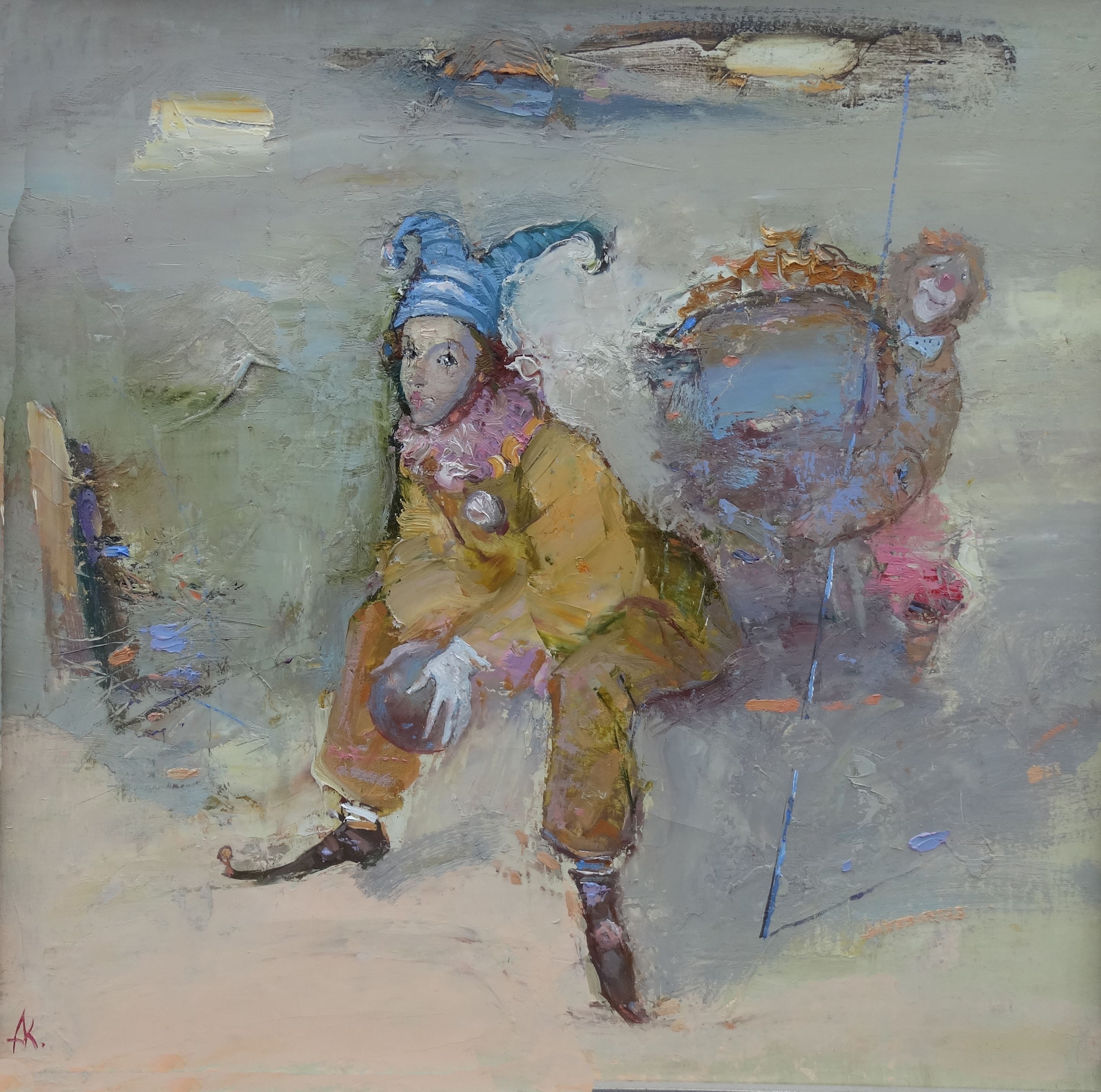 Работа транслирует тонкую эмоциональность момента. Арлекин — не персонаж комедии дель арте, а метафора: фигура, проживающая внутренний мир между двумя внешними действиями. Это образ артистического существования, когда в антракте, за кулисами, проявляется истинная, неигровая его сущность. Пауза — важнейший художественный элемент, и Костяников делает её полной смыслов. Позади арлекина видна слегка размытая фигура второго героя. Это может быть «отголосок действия», память только что прошедшей сцены или визуальная метафора творческого продолжения. Художник превращает паузу в самостоятельную сцену, в которой внимание сосредоточено не на внешнем, а на человеческом. Антракт — как вдох между двумя сердечными ударами.