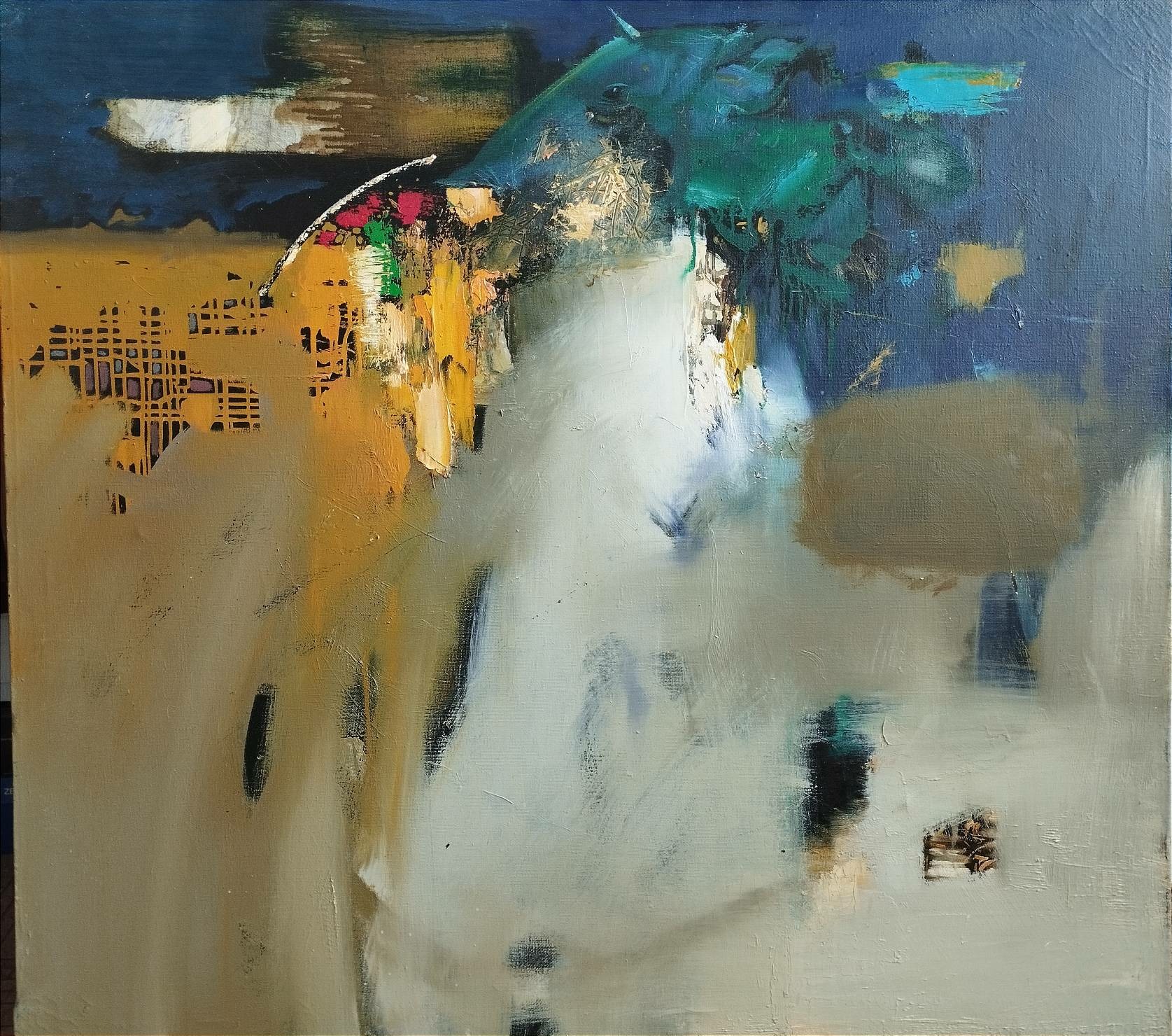 Основу полотна формирует мягкая серебристо-серая гамма, создающая атмосферу тумана или снежного мерцания. На её фоне яркие вспышки бирюзового, охристого и красного выступают эмоциональными пунктами, обозначая внутренние акценты сновидения. Верхняя часть композиции, насыщенная синими и зелёными тонами, напоминает небо — плотное, чуть тревожное пространство, из которого медленно вырастает силуэт лошади.