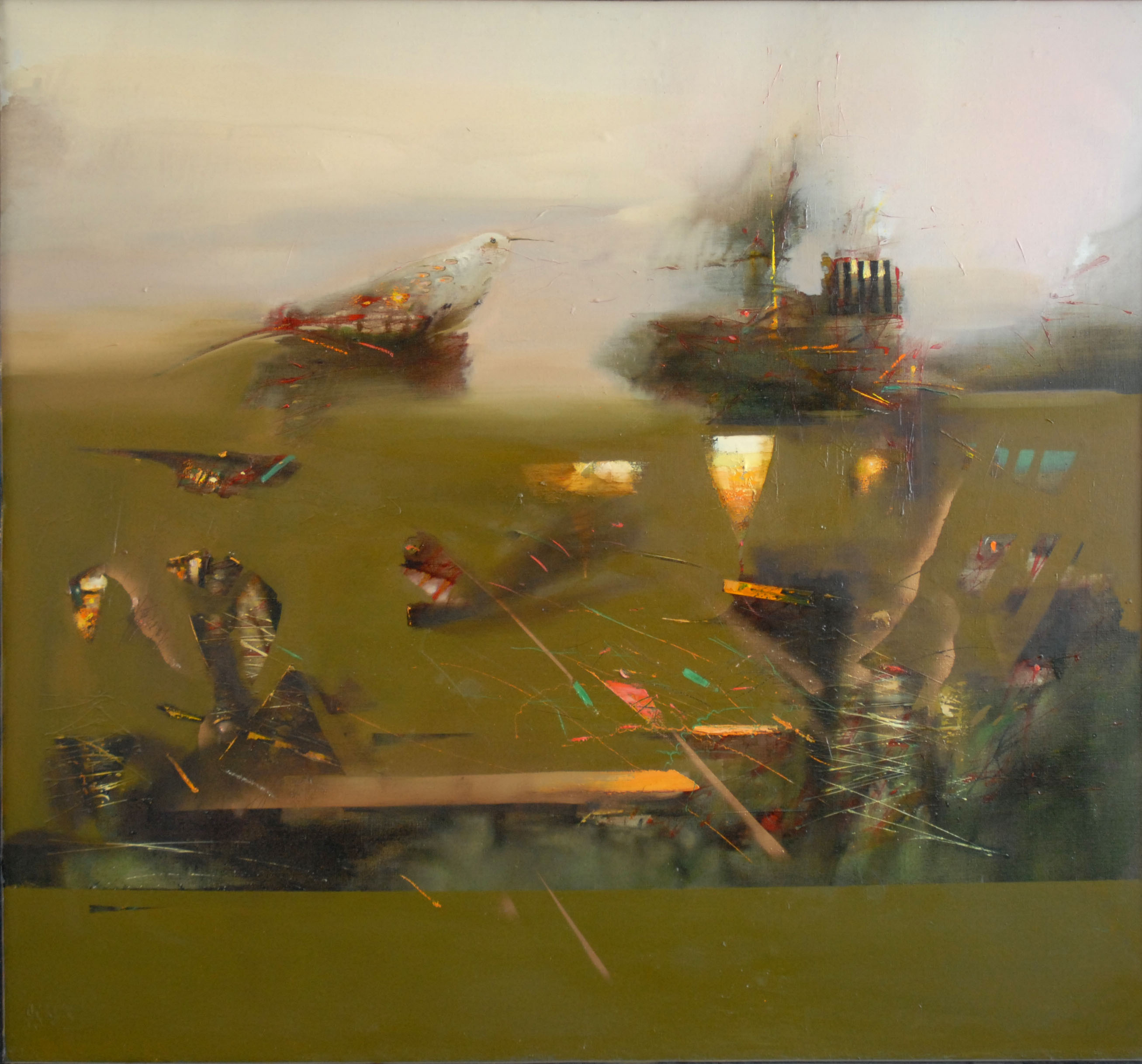 Композиция основана на мягком разделении полотна на два состояния: верхнее — светлое, туманно-воздушное, и нижнее — плотное, тяготеющее к земле. На их границе возникает слияние динамических форм, «пересечения траекторий». В левой части проступает образ птицы, в правой — структура, напоминающая корабль или архитектурную структуру. Эти полуфигуративные мотивы не читаются буквально, но усиливают смысловую пластику картины.