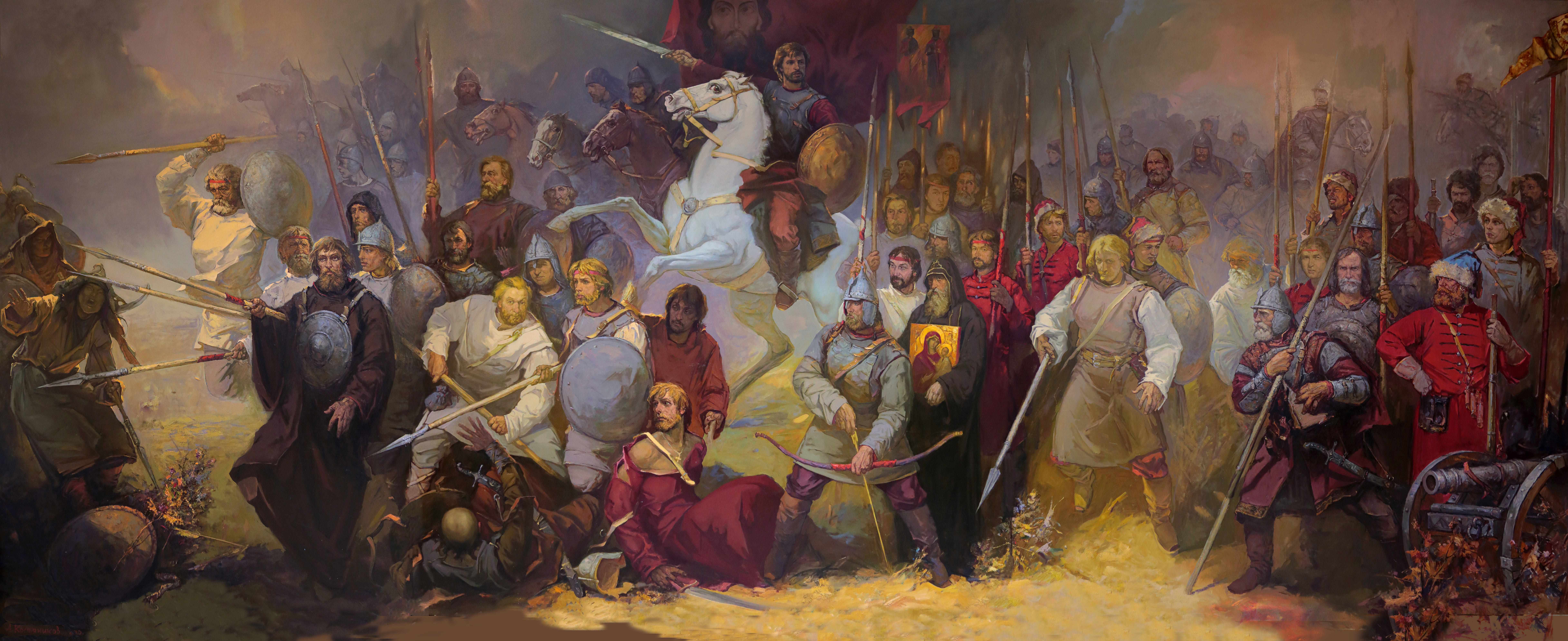 Вокруг него — плотные ряды ратников: стрельцы, московские служилые люди, дети боярские, монахи-черноризцы с иконой Богоматери, ополченцы. Они изображены с индивидуальными чертами, что подчеркивает мысль о народном характере сражения. Костяников тщательно прорабатывает детали вооружения и одежды, сочетая художественную выразительность с исторической достоверностью: кольчуги, кафтанные доспехи, длинные копья, сабли, щиты, древки знамён.