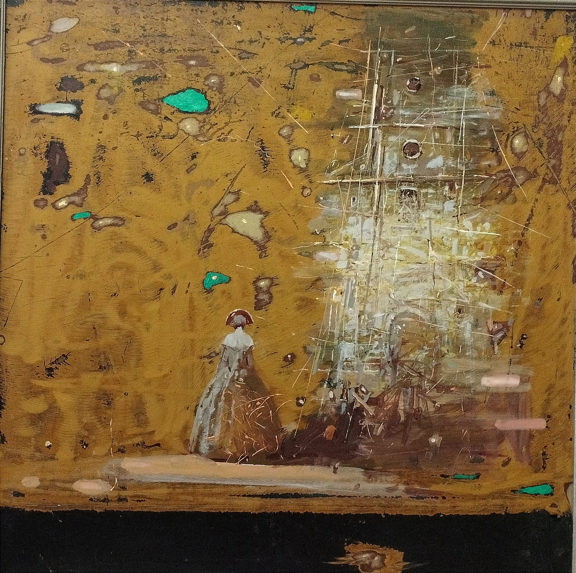 Это одна из серии работ Анатолий Гаврилович Костяников в которой он обращается к одному из ключевых библейских архетипов — Вавилонской башне, интерпретируя не конкретное повествование, а универсальный символизм человеческого стремления. В картине «У Вавилонской башни» художник развивает характерную для его позднего периода тему диалога человека и пространства. Архитектура здесь выступает не как конструкция, а как символ исторической и духовной структуры перегруженности мира. Сдержанная палитра, активный фон и напряжённая композиция формируют образ внутреннего состояния между стремлением к высоте и поиска момента, когда субъект больше не уверен, что его устремление принадлежит ему самому.