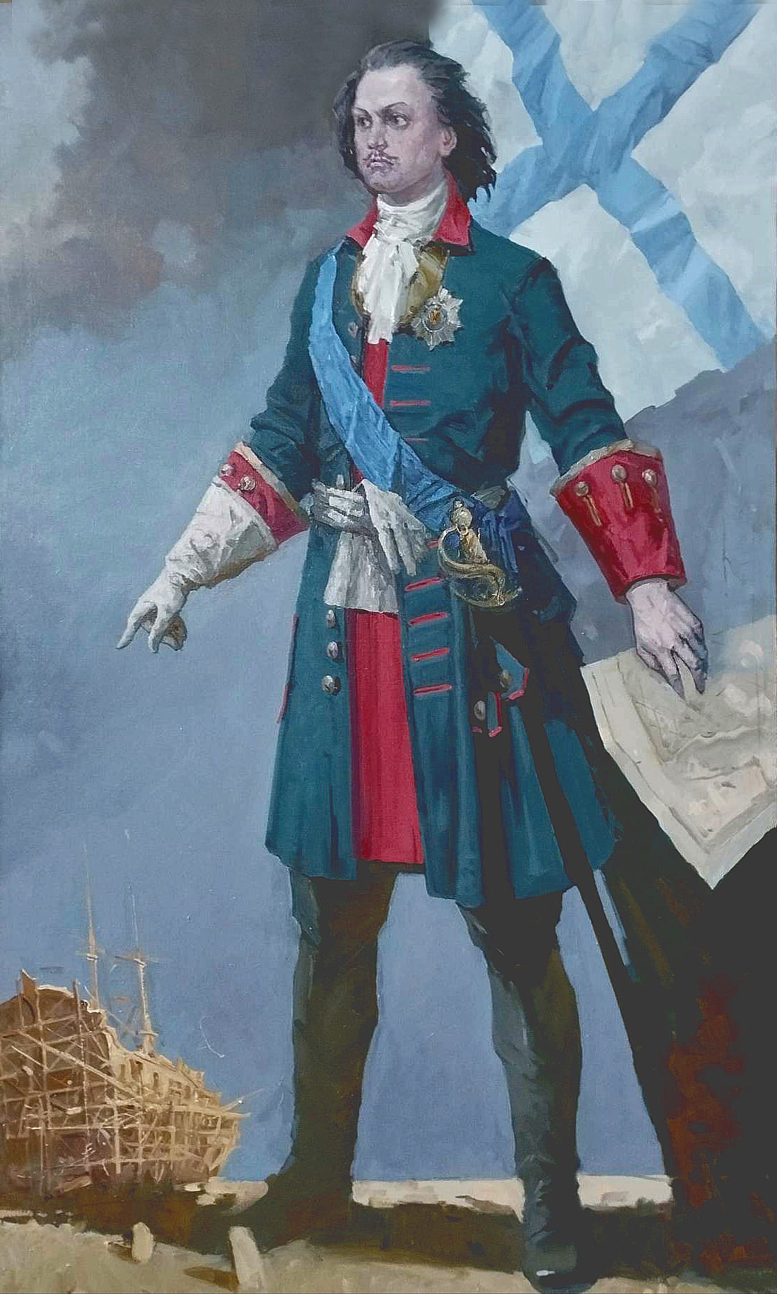 Эту работу художник показывает зрителю в ряду предлагаемого проекта «Арт история». Композиционный строй портрета, совершенно определённый и строится на встречных диагоналях, усиливающих устойчивость и стабильность стоящей фигуры. Силуэт молодого царя решительный чёткий и тонально ясный. Остов строящегося корабля на линии низкого горизонта, свидетельство Великого начала.